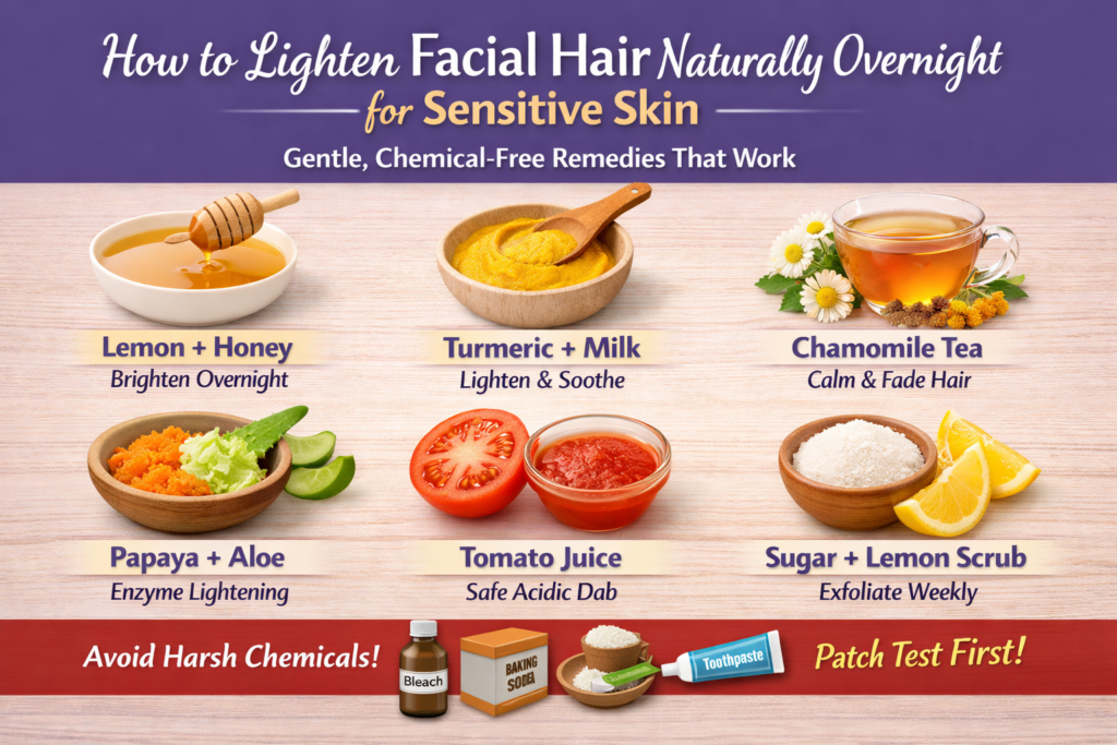 You can lighten facial hair naturally overnight using gentle, skin-friendly ingredients commonly found at home—without irritation or harsh chemicals.Facial hair is completely normal, yet for many people it can appear darker or more noticeable than they’d prefer—especially on the upper lip, chin, and jawline. For those with sensitive skin, chemical bleaches, salon creams, and razors often trigger redness, burning, dryness, or pigmentation.
